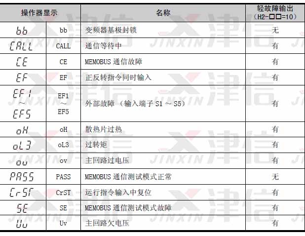 l  轻故障时∶进行多功能接点输出H2-01=10 (轻故障)的设定时,信号关闭。